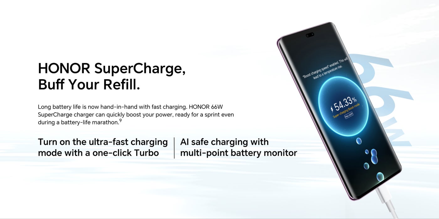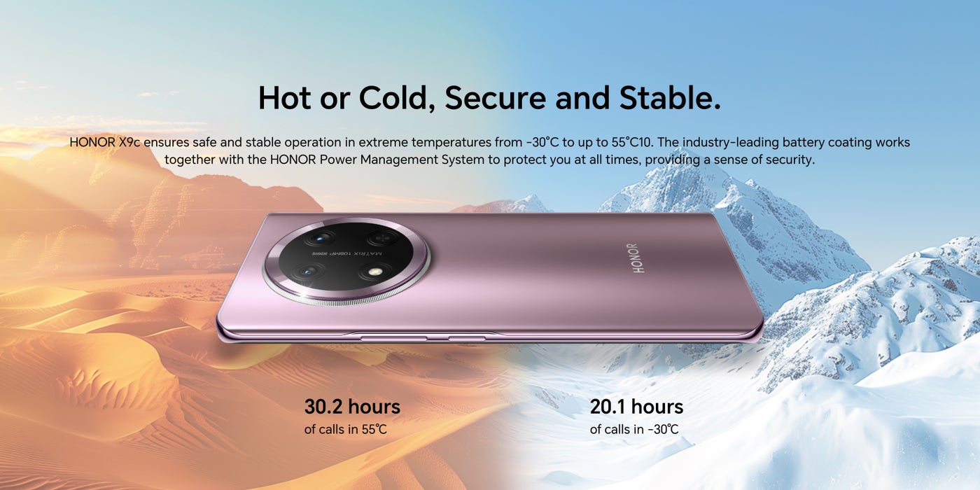 Packed with a powerful 6600mAh Silicon Carbon battery, the HONOR X9c provides up to 25.8 hours of online video playback or 48.4 hours of music streaming, and charges incredibly fast with HONOR’s 66W SuperCharge. Say goodbye to battery anxiety; the HONOR X9c is built for long-lasting performance and features a unique multi-point battery monitor for safe, AI-powered charging.
