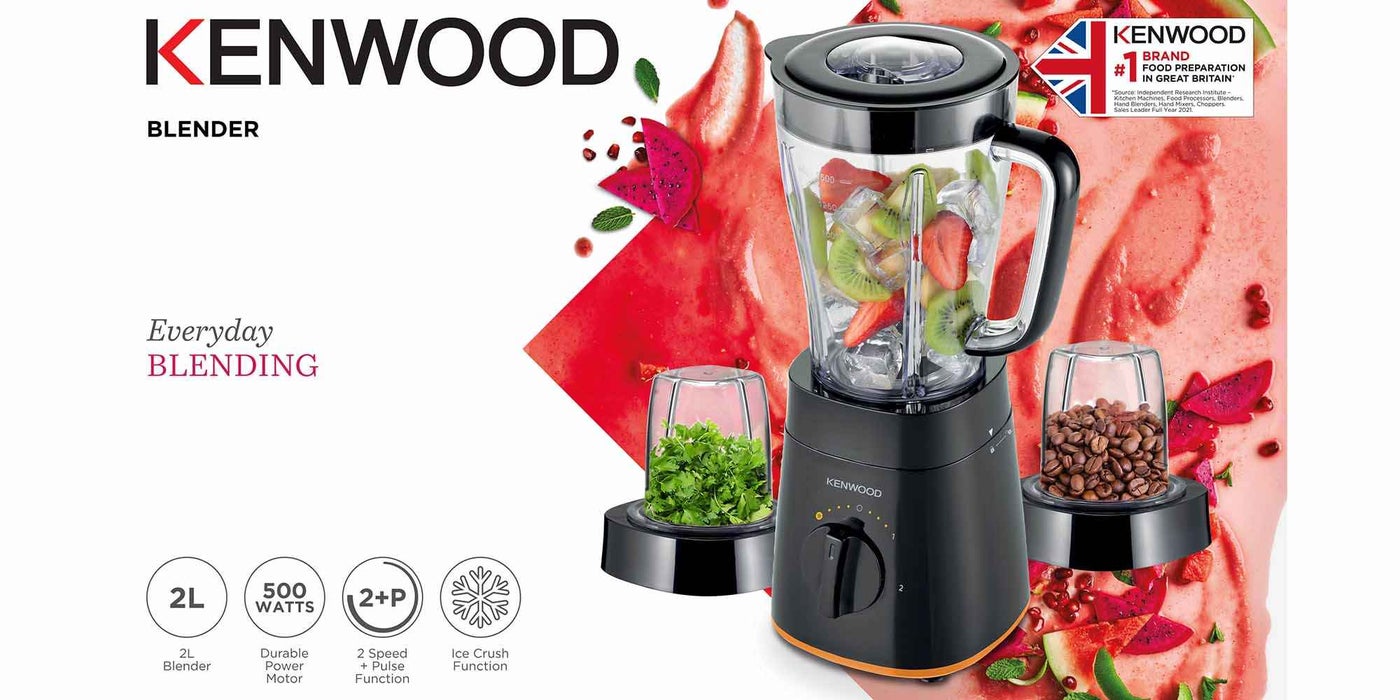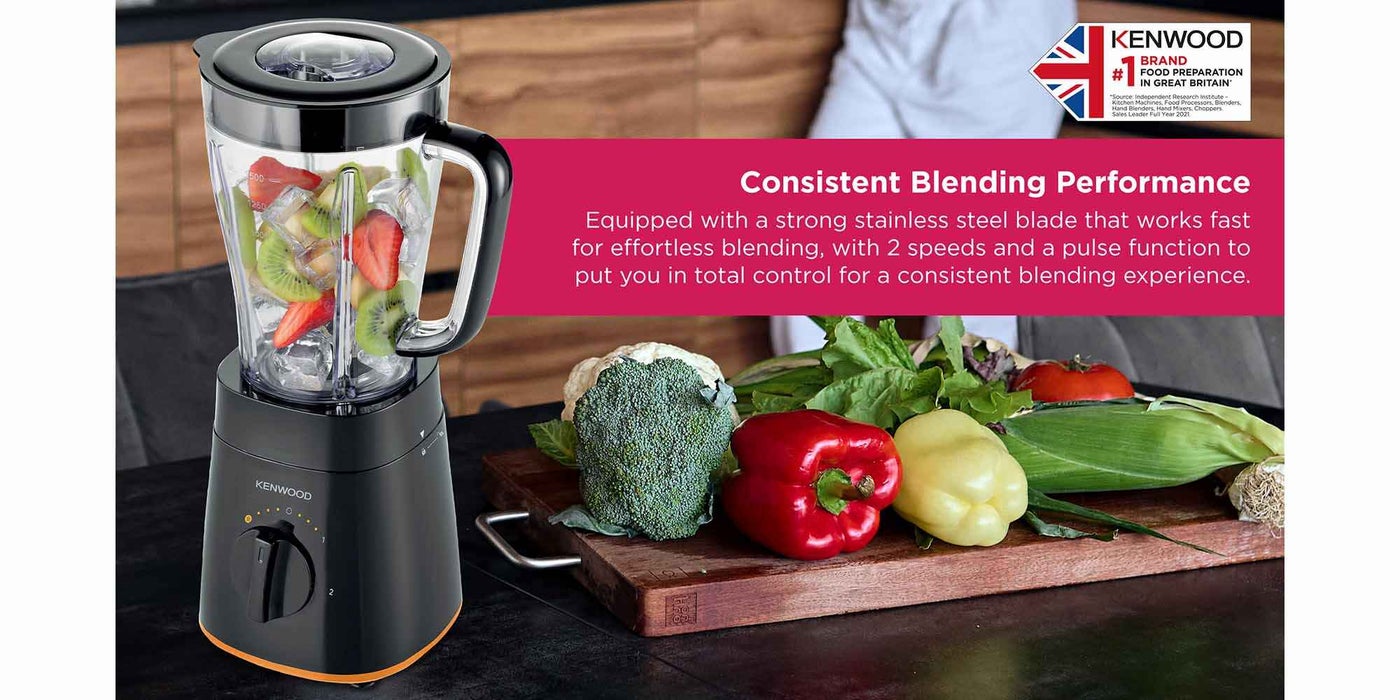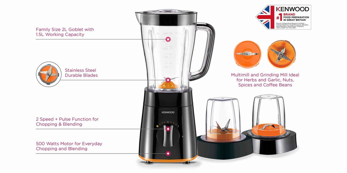 نظرة عامةخلاط كينوود بقوة 500 وات مع مطحنتين، لون أسود، BLP15.360BK، الطاقة: 500 وات، سعة 2 لتر، سعة عمل 1.5 لتر،2 مطحنة متعددة الاستخدامات لطحن القهوة والتوابل بسرعتين مع خاصية النبضات وأقدام مضادة للانزلاق