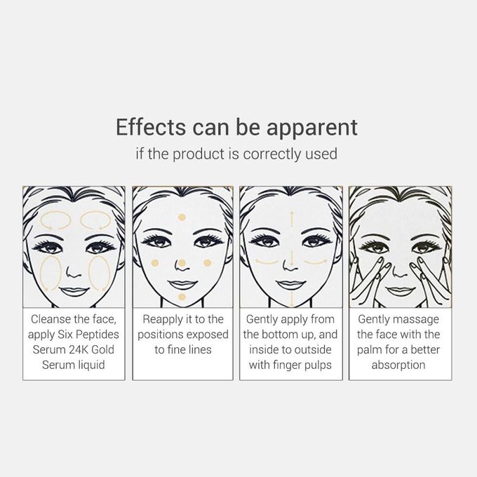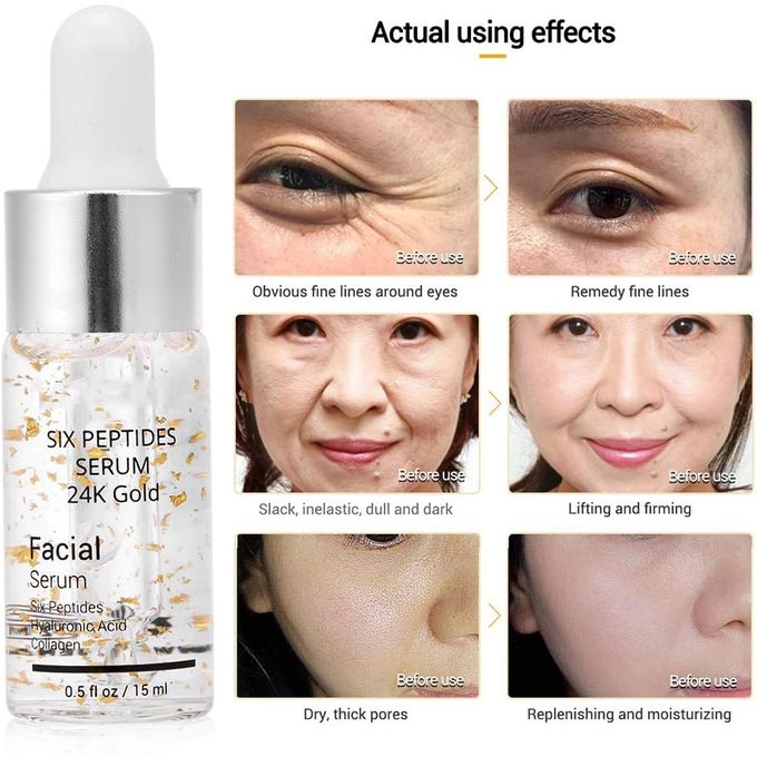 "24K Gold Peptide Serum - Rich in six peptides, Argireline, and natural plant extracts for anti-aging. It reduces fine lines, firms, moisturizes, and enhances skin elasticity and radiance. Safe for all skin types and can be used with masks or other skincare products. Boosts collagen production and repairs skin tissue, reducing wrinkles and keeping skin firm and hydrated. It can be used as a mask, mixed with creams or lotions, or as a mist for all-day hydration. Ideal for daily use for long-term results.