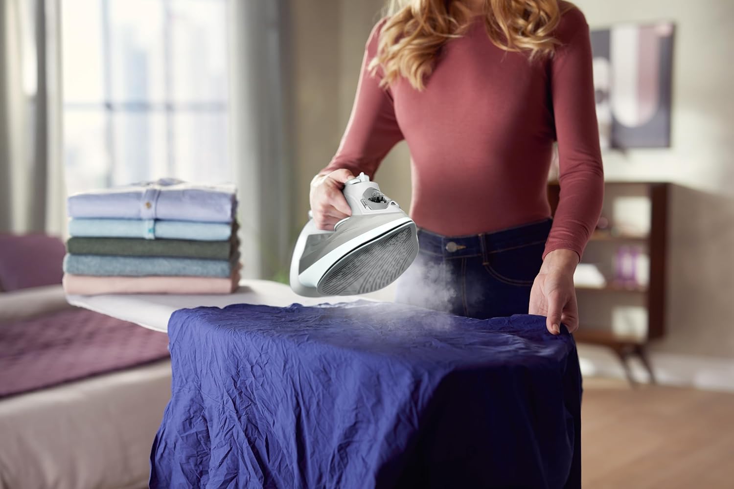 تسمح لك وظيفة البخار العمودي أن تعيدي النضارة إلى ثيابك مباشرة على العلاّقة وإزالة التجاعيد من الستائر وهي معلّقة. ما من حاجة إلى لوح كيّ.