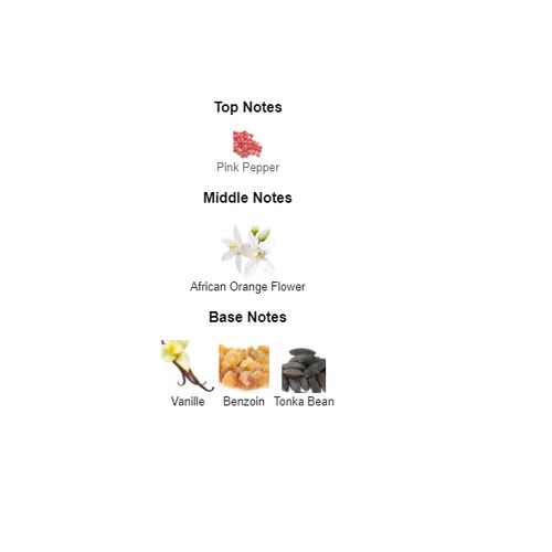 HEAD NOTES : Pink PepperHEART NOTES : African Orange FlowerBASE NOTES : Tonka Bean, Vanilla, Benzoin