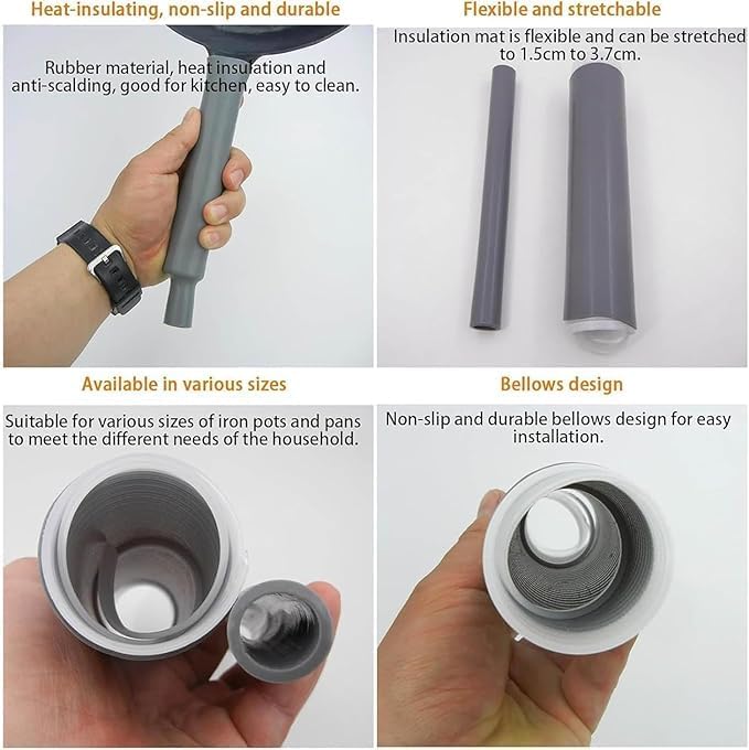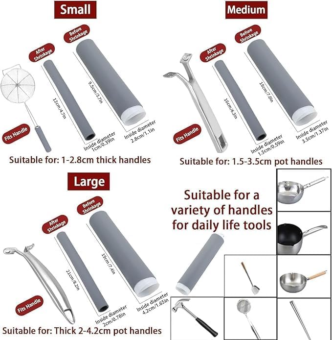 【Various Models Available and Wide Range of Uses】Our self shrink pan handle sleeves are designed to provide a secure and snug fit for various tool sizes, ensuring all-around protection and a comfortable grip. The silicone pot handle sleeve protector is suitable for handles of various shapes, not only for cast iron pots, metal frying pans, skillets, and griddles but also for garden tools, bike handlebars, door handles, racket handles for a better feel and repairs.