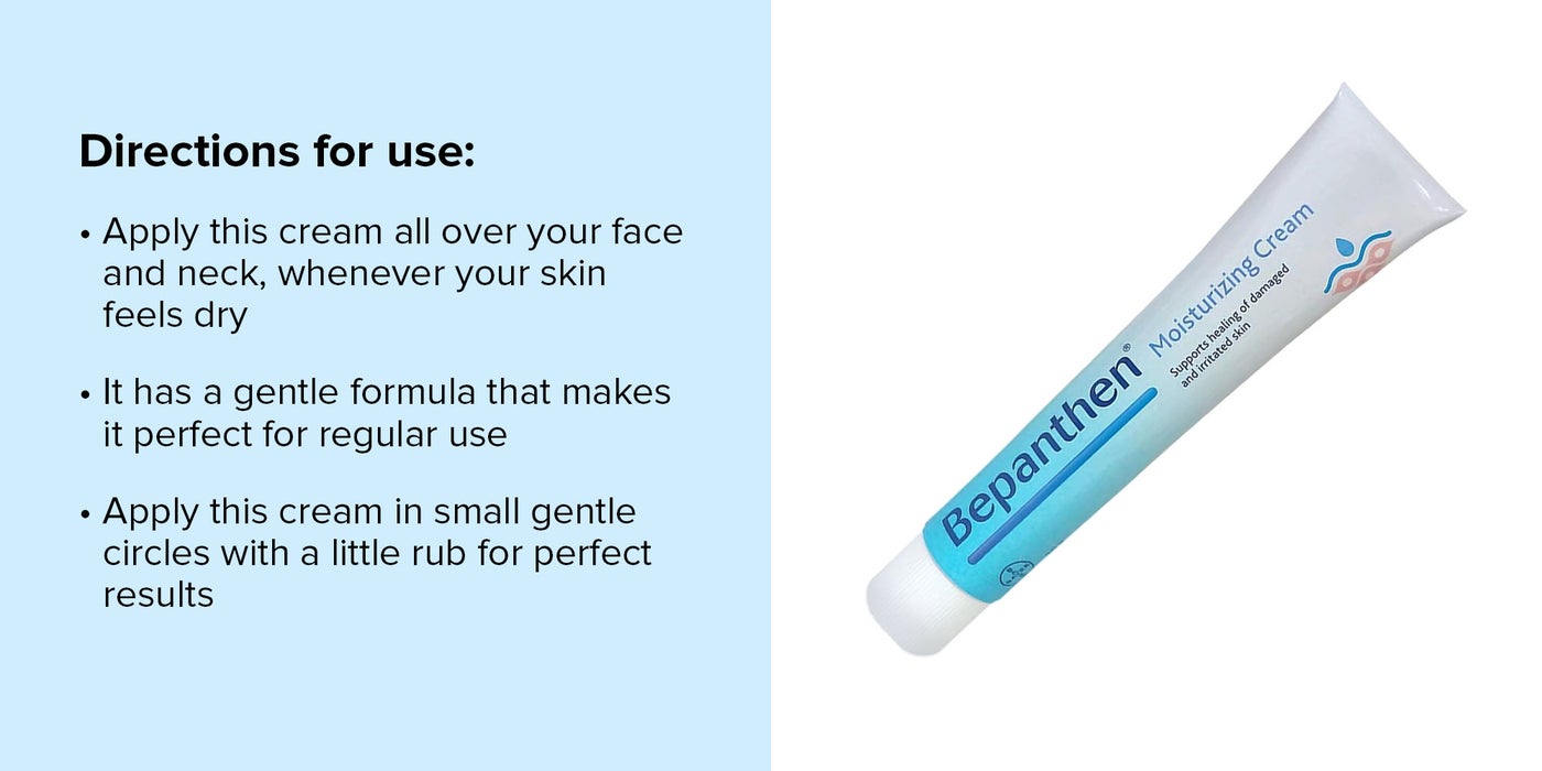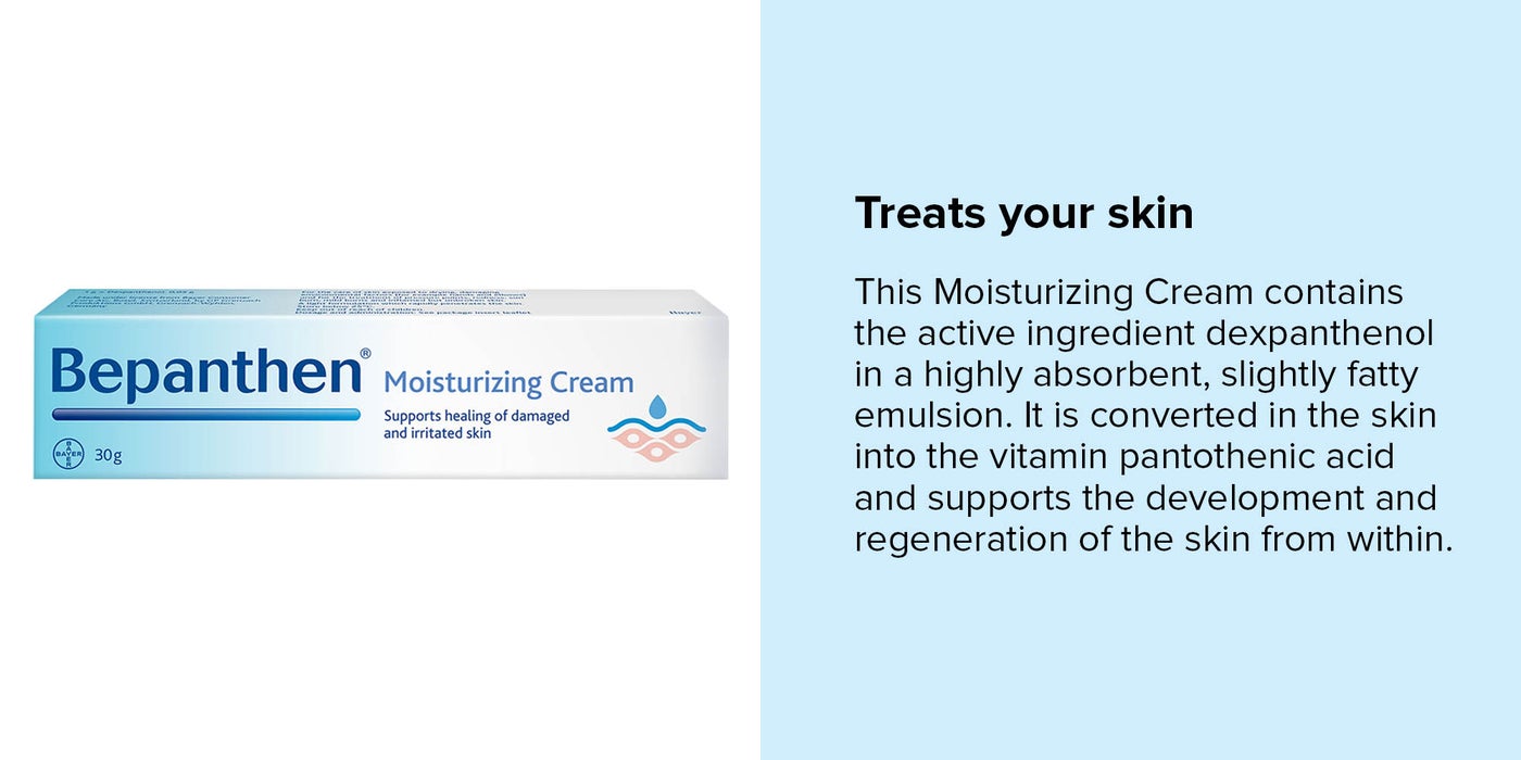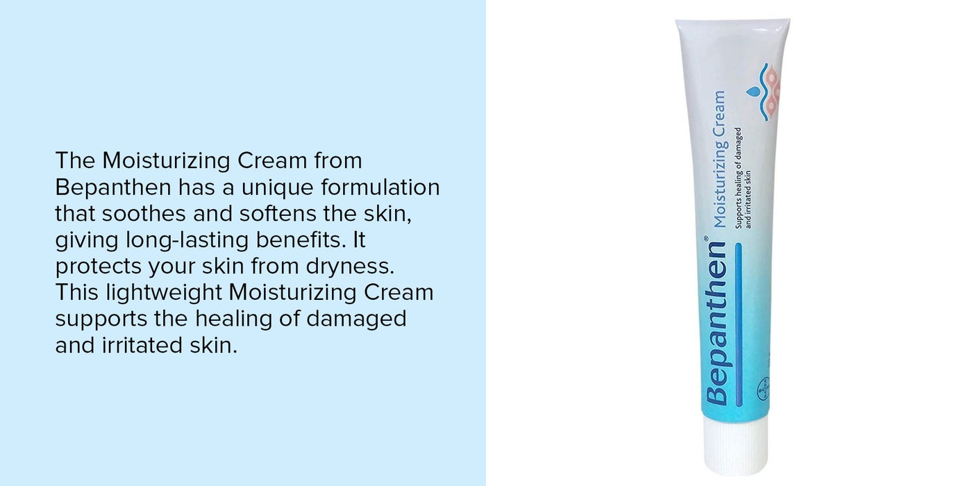Bepanthen cream does not contain any perfumes and colours. Scientifically formulated with Pro-Vitamin B5, nicknamed the skin vitamin, Bepanthen is at the cutting edge of skincare treatment after 75 years. Bepanthen moisturizing cream is a daily moisturizer for dry, damaged skin. A moisturizing cream that is formulated with Pro-Vitamin B5, which heals and protects vulnerable skin. A light, easily absorbed cream to care for skin exposed to everyday stresses and dryness. Bepanthen moisturizing cream is used for daily routine use, but can also be used to help rehydrate skin after sunburns.