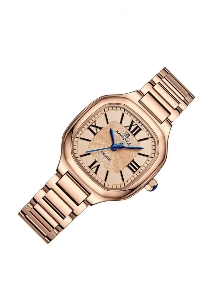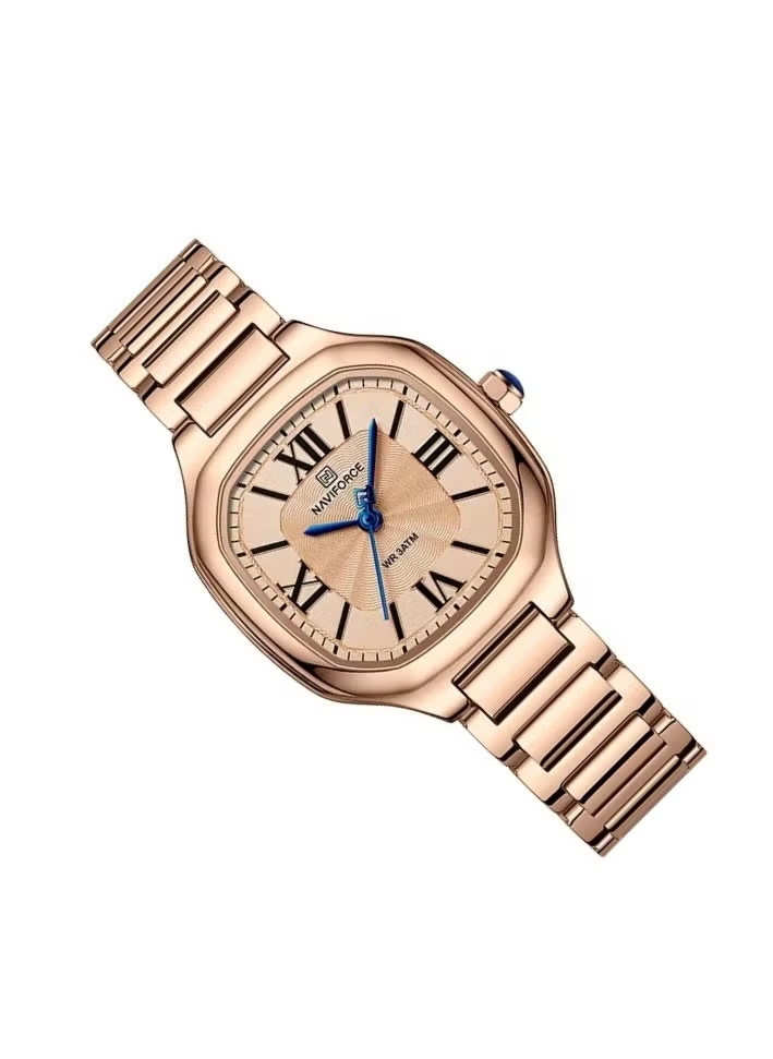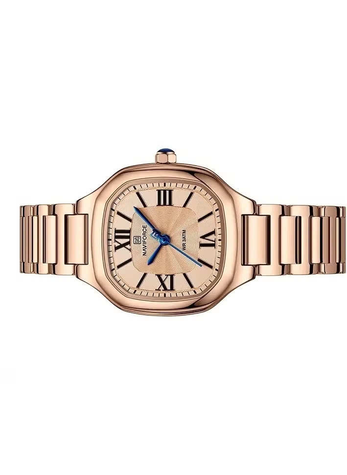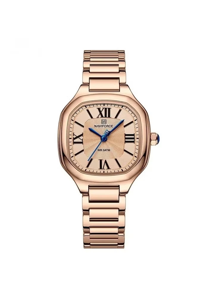 NAVIFORCE has been committed to creating charming watches for professional women, and NF5042 is not only a carrier of time but also a symbol of taste and confidence. The sleek square case lines and simple and generous design bring a refreshing visual beauty. The meticulously designed Roman numeral scale dial and stainless steel strap blend perfectly, showcasing both elegant taste and the straightforwardness of professional women. The imported quartz movement ensures precise timekeeping, allowing you to travel calmly and freely. With a 30-meter waterproof design, it easily handles hand washing and light rain in daily life. Whether for daily leisure, business work, or social gatherings, NF5042 can be perfectly matched. Its exquisite craftsmanship and elegant design not only allow you to exude confidence and charm in any occasion but also add infinite brilliance to your life. At the same time, we have a professional after-sales team to solve customers’ problems and needs at any time, ensuring a consistent shopping experience. ◉ Timeless elegance and fashion: The unique Roman numeral scale dial with rose pattern is elegant yet personalized, showcasing the unique taste and charm of women. ◉ Unique square case: NF5042 stands out with its unique geometric-shaped case design, contrasting sharply with traditional round cases. After fine polishing, the case presents a bright luster, highlighting excellent craftsmanship and quality. ◉ Exquisite stainless steel strap: The stainless steel strap features a double-push folding clasp design, which is not only convenient and comfortable but also perfectly matches various occasions of daily leisure and business commuting. ◉ Precision high-quality imported movement: Equipped with an excellent imported quartz movement, providing precise timekeeping function while extending the service life of the watch. ◉ 3ATM waterproof: With a 3ATM waterproof function, you don’t have to worry about issues such as hand washing and light rain in daily life, keeping the watch clean and delicate. ◉ Hardened mineral glass : NF5042 adopts hardened mineral glass mirror, with excellent abrasion resistance, effectively resisting scratches and wear in daily use, ensuring clear and transparent surface. ◉ Anti-slip crown: The exquisitely shaped crown design adds highlights to the details and enhances friction, making it more convenient to adjust the time. ◉ Perfect gift: NF5042 is not just a watch but also a perfect gift for special women. With exquisite design and elegant appearance, it comes with a beautiful box. Whether it’s for mother, wife, sister, or friend, it is a thoughtful and fashionable gift. Choose NF5042 watch to define an elegant and charming style of timekeeping. We are committed to providing personalized customization services for wholesalers, tailoring unique products according to market demand and customer preferences to meet your diverse needs.
