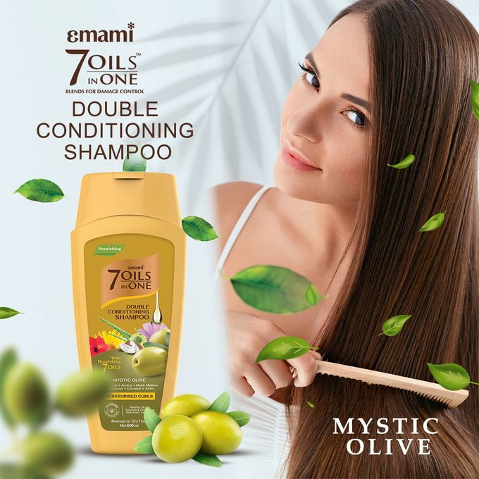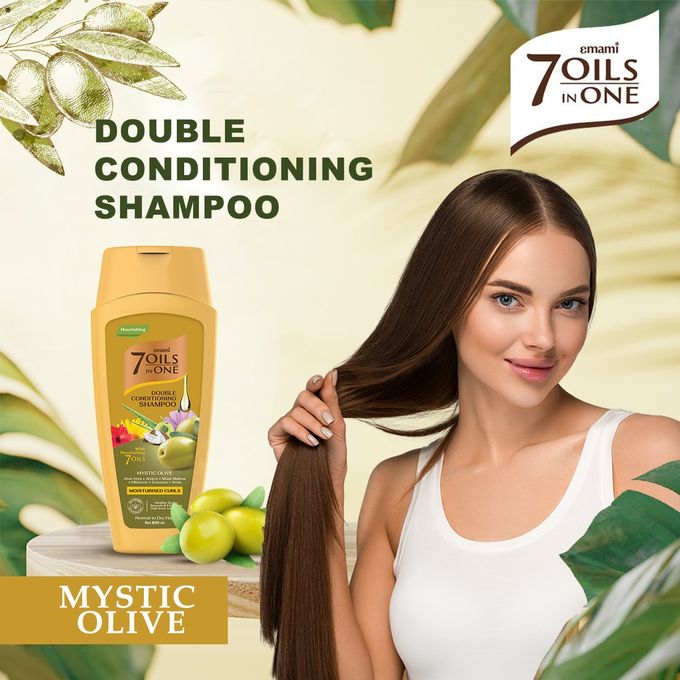 - The Emami 7 Oils in One Double Conditioning Shampoo Mystic Olive helps melt away knots and tangles allowing for a smooth and pain free detangling session. - this Shampoo restores luster to hair strands leaving hair feeling beautiful, soft, glossy and healthy with a natural shine. This Shampoo helps to tame frizz, smooth the cuticles in your hair, allowing hair to look shiny, and feel healthy. - How to use: Pour a small amount of shampoo into the palm of your hand, gently massage the shampoo into your scalp using your fingertips. Make sure to distribute it evenly on the scalp. Rinse your hair well with lukewarm water until traces of shampoo disappear.