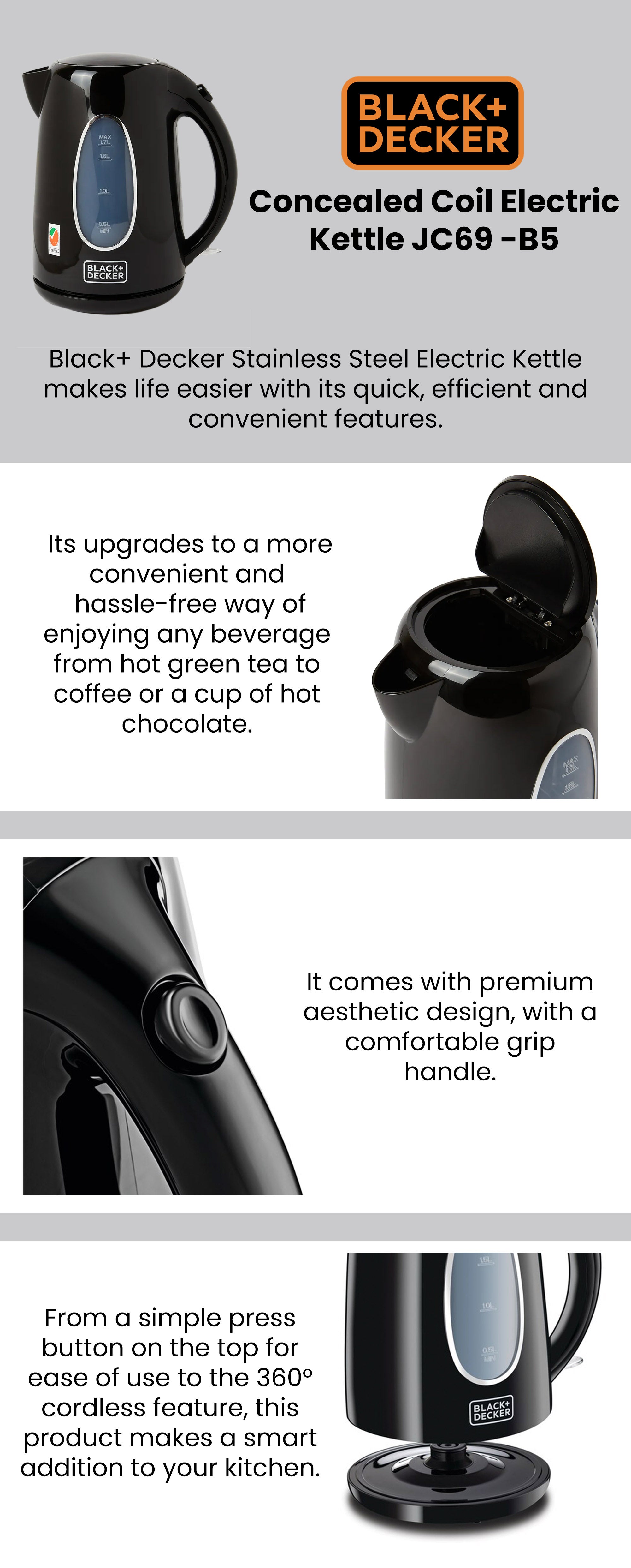 المميزات: قدرة 2200 وات وسعة 1.7 لتر حلقة من الكروم للزينة حول نافذة الماء لمزيد من الجمال، غلاية بسلك موصل ملفوف مخفي مريح بزاوية 360 درجة لسهولة الاستخدام والنظافة والتخزين، إغلاق تلقائي وحماية من الغليان الجاف لزيادة السلامة وكفاءة الطاقة، فلتر قابل للإزالة لسهولة التنظيف، زر ضغط لفتح الغطاء، مؤشر نافذة مستوى الماء، مفتاح تشغيل/إيقاف مع مؤشر ضوء أحمر